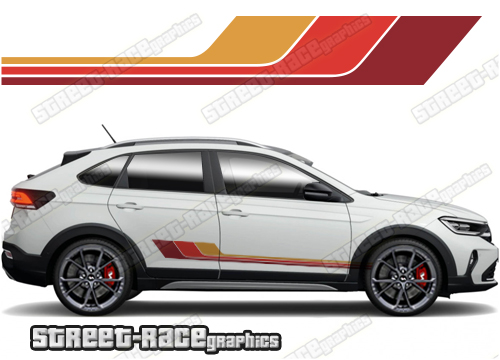 Volkswagen Taigo racing stripes. They are shown on the first generation Taigo but they can be trimmed to fit all later versions and facelift variants. The decals are not pre-cut for any specific Volkswagen Taigo version; they do not have any door handle cutouts, wheel arch or door line splits. These will require trimming during fitting. Vinyl will not stick to unpainted textured plastics.