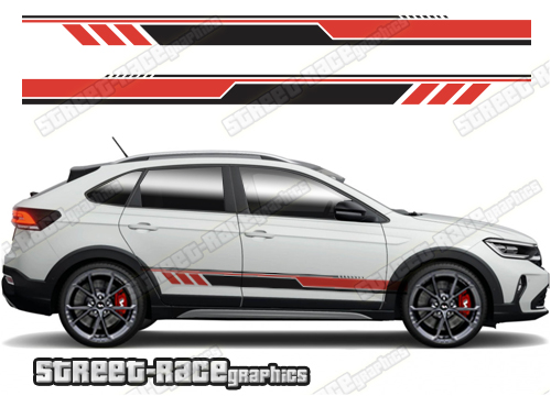 Volkswagen Taigo racing stripes. They are shown on the first generation Taigo but they can be trimmed to fit all later versions and facelift variants. The decals are not pre-cut for any specific Volkswagen Taigo version; they do not have any door handle cutouts, wheel arch or door line splits. These will require trimming during fitting. Vinyl will not stick to unpainted textured plastics.
