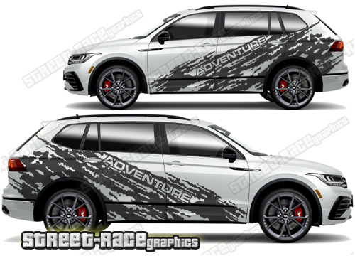 Volkswagen Tiguan graphics. They are shown on the first generation Tiguan but they can be trimmed to fit all later versions and facelift variants. The decals are not pre-cut for any specific Volkswagen Tiguan version; they do not have any door handle cutouts, wheel arch or door line splits. These will require trimming during fitting. Vinyl will not stick to unpainted textured plastics.