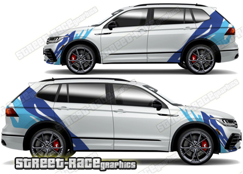 Volkswagen Tiguan graphics. They are shown on the first generation Tiguan but they can be trimmed to fit all later versions and facelift variants. The decals are not pre-cut for any specific Volkswagen Tiguan version; they do not have any door handle cutouts, wheel arch or door line splits. These will require trimming during fitting. Vinyl will not stick to unpainted textured plastics.