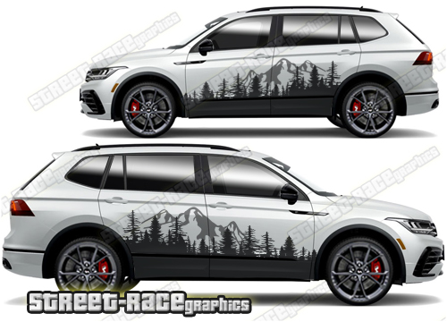 Volkswagen Tiguan graphics. They are shown on the first generation Tiguan but they can be trimmed to fit all later versions and facelift variants. The decals are not pre-cut for any specific Volkswagen Tiguan version; they do not have any door handle cutouts, wheel arch or door line splits. These will require trimming during fitting. Vinyl will not stick to unpainted textured plastics.