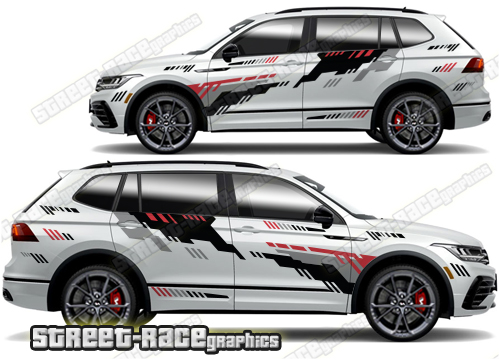 Volkswagen Tiguan graphics. They are shown on the first generation Tiguan but they can be trimmed to fit all later versions and facelift variants. The decals are not pre-cut for any specific Volkswagen Tiguan version; they do not have any door handle cutouts, wheel arch or door line splits. These will require trimming during fitting. Vinyl will not stick to unpainted textured plastics.
