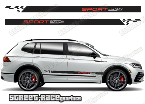 Volkswagen Tiguan racings stripes. They are shown on the first generation Tiguan but they can be trimmed to fit all later versions and facelift variants. The decals are not pre-cut for any specific Volkswagen Tiguan version; they do not have any door handle cutouts, wheel arch or door line splits. These will require trimming during fitting. Vinyl will not stick to unpainted textured plastics.