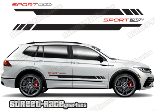 Volkswagen Tiguan racings stripes. They are shown on the first generation Tiguan but they can be trimmed to fit all later versions and facelift variants. The decals are not pre-cut for any specific Volkswagen Tiguan version; they do not have any door handle cutouts, wheel arch or door line splits. These will require trimming during fitting. Vinyl will not stick to unpainted textured plastics.