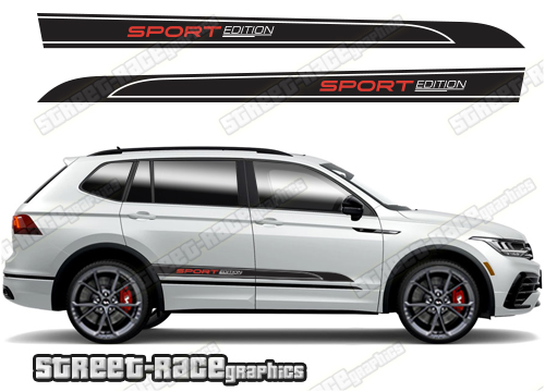 Volkswagen Tiguan racings stripes. They are shown on the first generation Tiguan but they can be trimmed to fit all later versions and facelift variants. The decals are not pre-cut for any specific Volkswagen Tiguan version; they do not have any door handle cutouts, wheel arch or door line splits. These will require trimming during fitting. Vinyl will not stick to unpainted textured plastics.