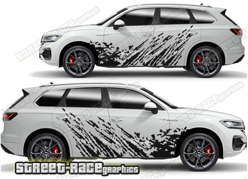 Volkswagen Touareg graphics. They are shown on the first generation Touareg but they can be trimmed to fit all later versions and facelift variants. The decals are not pre-cut for any specific Volkswagen Touareg version; they do not have any door handle cutouts, wheel arch or door line splits. These will require trimming during fitting. Vinyl will not stick to unpainted textured plastics.