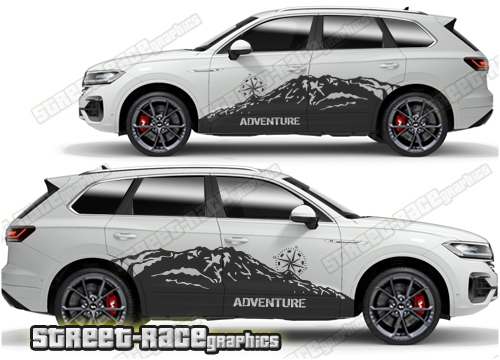 Volkswagen Touareg graphics. They are shown on the first generation Touareg but they can be trimmed to fit all later versions and facelift variants. The decals are not pre-cut for any specific Volkswagen Touareg version; they do not have any door handle cutouts, wheel arch or door line splits. These will require trimming during fitting. Vinyl will not stick to unpainted textured plastics.