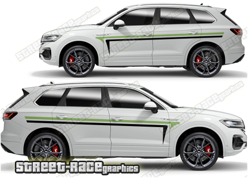 Volkswagen Touareg graphics. They are shown on the first generation Touareg but they can be trimmed to fit all later versions and facelift variants. The decals are not pre-cut for any specific Volkswagen Touareg version; they do not have any door handle cutouts, wheel arch or door line splits. These will require trimming during fitting. Vinyl will not stick to unpainted textured plastics.