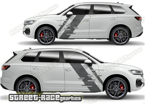 Volkswagen Touareg graphics. They are shown on the first generation Touareg but they can be trimmed to fit all later versions and facelift variants. The decals are not pre-cut for any specific Volkswagen Touareg version; they do not have any door handle cutouts, wheel arch or door line splits. These will require trimming during fitting. Vinyl will not stick to unpainted textured plastics.