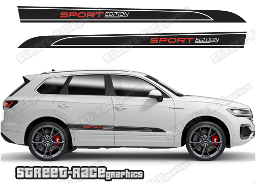 Volkswagen Touareg racing stripes. They are shown on the first generation Touareg but they can be trimmed to fit all later versions and facelift variants. The decals are not pre-cut for any specific Volkswagen Touareg version; they do not have any door handle cutouts, wheel arch or door line splits. These will require trimming during fitting. Vinyl will not stick to unpainted textured plastics.