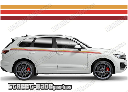 Volkswagen Touareg racing stripes. They are shown on the first generation Touareg but they can be trimmed to fit all later versions and facelift variants. The decals are not pre-cut for any specific Volkswagen Touareg version; they do not have any door handle cutouts, wheel arch or door line splits. These will require trimming during fitting. Vinyl will not stick to unpainted textured plastics.