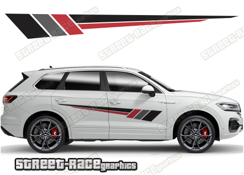 Volkswagen Touareg racing stripes. They are shown on the first generation Touareg but they can be trimmed to fit all later versions and facelift variants. The decals are not pre-cut for any specific Volkswagen Touareg version; they do not have any door handle cutouts, wheel arch or door line splits. These will require trimming during fitting. Vinyl will not stick to unpainted textured plastics.