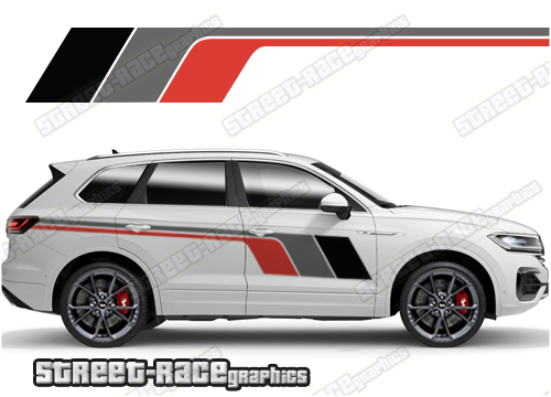 Volkswagen Touareg racing stripes. They are shown on the first generation Touareg but they can be trimmed to fit all later versions and facelift variants. The decals are not pre-cut for any specific Volkswagen Touareg version; they do not have any door handle cutouts, wheel arch or door line splits. These will require trimming during fitting. Vinyl will not stick to unpainted textured plastics.