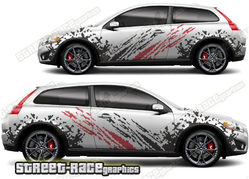 Volvo C30 large graphics. They are a universal fit to suit all Volvo C30 cars and facelift variants. There are no cutouts for the door handles, wheel arches or door lines; these will require trimming during fitting.