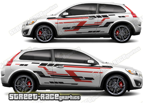 Volvo C30 large graphics. They are a universal fit to suit all Volvo C30 cars and facelift variants. There are no cutouts for the door handles, wheel arches or door lines; these will require trimming during fitting.