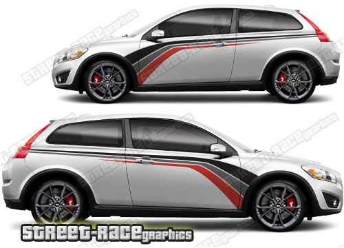 Volvo C30 large graphics. They are a universal fit to suit all Volvo C30 cars and facelift variants. There are no cutouts for the door handles, wheel arches or door lines; these will require trimming during fitting.