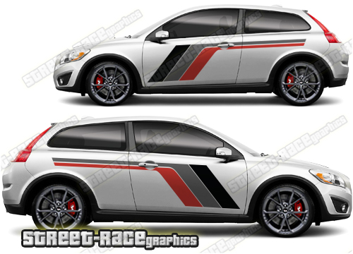 Volvo C30 large graphics. They are a universal fit to suit all Volvo C30 cars and facelift variants. There are no cutouts for the door handles, wheel arches or door lines; these will require trimming during fitting.