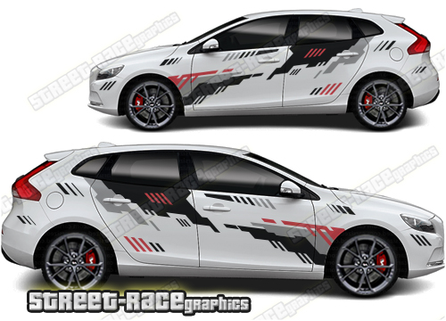 Volvo V40 large graphics. They are a universal fit to suit all Volvo V40 cars and facelift variants. There are no cutouts for the door handles, wheel arches or door lines; these will require trimming during fitting.