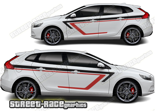Volvo V40 large graphics. They are a universal fit to suit all Volvo V40 cars and facelift variants. There are no cutouts for the door handles, wheel arches or door lines; these will require trimming during fitting.