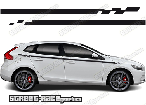Volvo V40 racing stripes. They are a universal fit to suit all Volvo V40 cars and facelift variants from MK1 onwards. There are no cutouts for the wheel arches or door lines; these will require trimming during fitting.