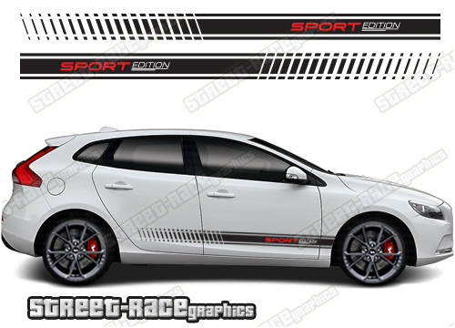 Volvo V40 racing stripes. They are a universal fit to suit all Volvo V40 cars and facelift variants from MK1 onwards. There are no cutouts for the wheel arches or door lines; these will require trimming during fitting.