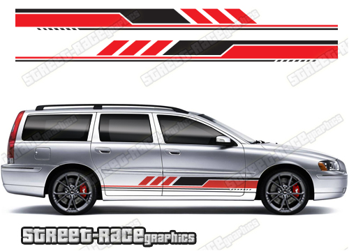 Volvo V70 racing stripes. They are a universal fit to suit all Volvo V70 estate / station wagon cars and facelift variants from MK1 onwards. There are no cutouts for the wheel arches or door lines; these will require trimming during fitting.