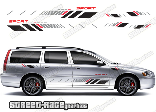 Volvo V70 racing stripes. They are a universal fit to suit all Volvo V70 estate / station wagon cars and facelift variants from MK1 onwards. There are no cutouts for the wheel arches or door lines; these will require trimming during fitting.