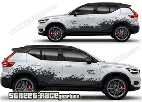 Volvo XC40 graphics. They are shown on the first generation XC40 but they can be trimmed to fit all later versions and facelift variants. The decals are not pre-cut for any specific Volvo XC40 version; they do not have any door handle cutouts, wheel arch or door line splits. These will require trimming during fitting. Vinyl will not stick to unpainted textured plastics.