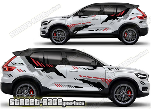 Volvo XC40 graphics. They are shown on the first generation XC40 but they can be trimmed to fit all later versions and facelift variants. The decals are not pre-cut for any specific Volvo XC40 version; they do not have any door handle cutouts, wheel arch or door line splits. These will require trimming during fitting. Vinyl will not stick to unpainted textured plastics.
