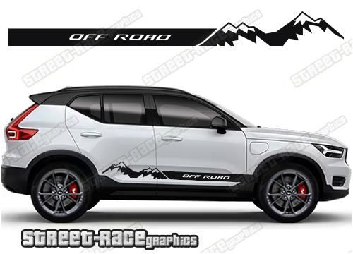 Volvo XC40 racing stripes. They are shown on the first generation XC40 but they can be trimmed to fit all later versions and facelift variants. The decals are not pre-cut for any specific Volvo XC40 version; they do not have any door handle cutouts, wheel arch or door line splits. These will require trimming during fitting. Vinyl will not stick to unpainted textured plastics.