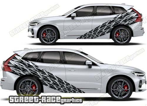 Volvo XC60 graphics. They are shown on the first generation XC60 but they can be trimmed to fit all later versions and facelift variants. The decals are not pre-cut for any specific Volvo XC60 version; they do not have any door handle cutouts, wheel arch or door line splits. These will require trimming during fitting. Vinyl will not stick to unpainted textured plastics.