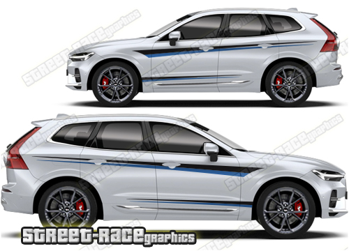Volvo XC60 graphics. They are shown on the first generation XC60 but they can be trimmed to fit all later versions and facelift variants. The decals are not pre-cut for any specific Volvo XC60 version; they do not have any door handle cutouts, wheel arch or door line splits. These will require trimming during fitting. Vinyl will not stick to unpainted textured plastics.