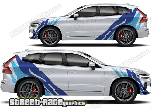 Volvo XC60 graphics. They are shown on the first generation XC60 but they can be trimmed to fit all later versions and facelift variants. The decals are not pre-cut for any specific Volvo XC60 version; they do not have any door handle cutouts, wheel arch or door line splits. These will require trimming during fitting. Vinyl will not stick to unpainted textured plastics.