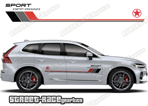 Volvo XC60 racing stripes. They are shown on the first generation XC60 but they can be trimmed to fit all later versions and facelift variants. The decals are not pre-cut for any specific Volvo XC60 version; they do not have any door handle cutouts, wheel arch or door line splits. These will require trimming during fitting. Vinyl will not stick to unpainted textured plastics.