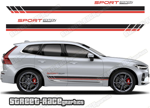 Volvo XC60 racing stripes. They are shown on the first generation XC60 but they can be trimmed to fit all later versions and facelift variants. The decals are not pre-cut for any specific Volvo XC60 version; they do not have any door handle cutouts, wheel arch or door line splits. These will require trimming during fitting. Vinyl will not stick to unpainted textured plastics.