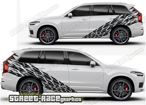 Volvo XC90 graphics. They are shown on the first generation XC90 but they can be trimmed to fit all later versions and facelift variants. The decals are not pre-cut for any specific Volvo XC90 version; they do not have any door handle cutouts, wheel arch or door line splits. These will require trimming during fitting. Vinyl will not stick to unpainted textured plastics.