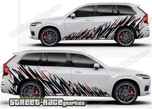 Volvo XC90 graphics. They are shown on the first generation XC90 but they can be trimmed to fit all later versions and facelift variants. The decals are not pre-cut for any specific Volvo XC90 version; they do not have any door handle cutouts, wheel arch or door line splits. These will require trimming during fitting. Vinyl will not stick to unpainted textured plastics.