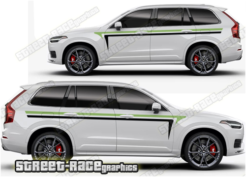 Volvo XC90 graphics. They are shown on the first generation XC90 but they can be trimmed to fit all later versions and facelift variants. The decals are not pre-cut for any specific Volvo XC90 version; they do not have any door handle cutouts, wheel arch or door line splits. These will require trimming during fitting. Vinyl will not stick to unpainted textured plastics.