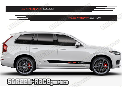 Volvo XC90 racing stripes. They are shown on the first generation XC90 but they can be trimmed to fit all later versions and facelift variants. The decals are not pre-cut for any specific Volvo XC90 version; they do not have any door handle cutouts, wheel arch or door line splits. These will require trimming during fitting. Vinyl will not stick to unpainted textured plastics.