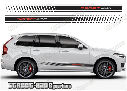 Volvo XC90 racing stripes. They are shown on the first generation XC90 but they can be trimmed to fit all later versions and facelift variants. The decals are not pre-cut for any specific Volvo XC90 version; they do not have any door handle cutouts, wheel arch or door line splits. These will require trimming during fitting. Vinyl will not stick to unpainted textured plastics.