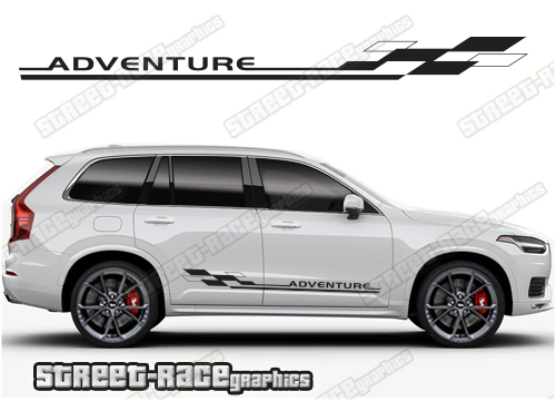 Volvo XC90 racing stripes. They are shown on the first generation XC90 but they can be trimmed to fit all later versions and facelift variants. The decals are not pre-cut for any specific Volvo XC90 version; they do not have any door handle cutouts, wheel arch or door line splits. These will require trimming during fitting. Vinyl will not stick to unpainted textured plastics.