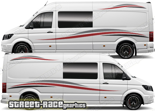 VW Crafter MK2 camper van graphics. These are ideal for giving your existing camper a new look or to finish off a new camper van conversion project. We offer these decals in a range of sizes to suit the different wheelbase versions of the Volkswagen Crafter.