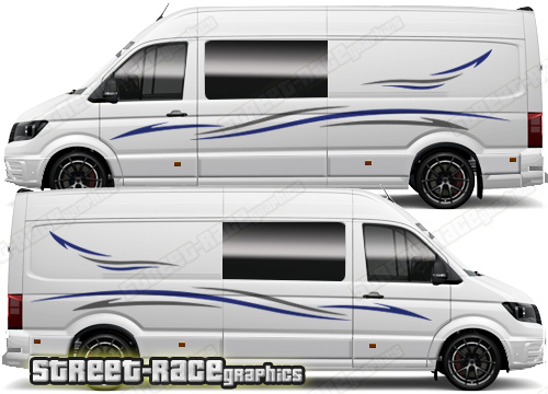 VW Crafter MK2 camper van graphics. These are ideal for giving your existing camper a new look or to finish off a new camper van conversion project. We offer these decals in a range of sizes to suit the different wheelbase versions of the Volkswagen Crafter.