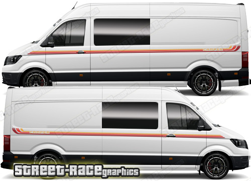 VW Crafter MK2 camper van retro graphics. These are ideal for giving your existing camper a new look or to finish off a new camper van conversion project. We offer these decals in a range of sizes to suit the different wheelbase versions of the Volkswagen Crafter.
