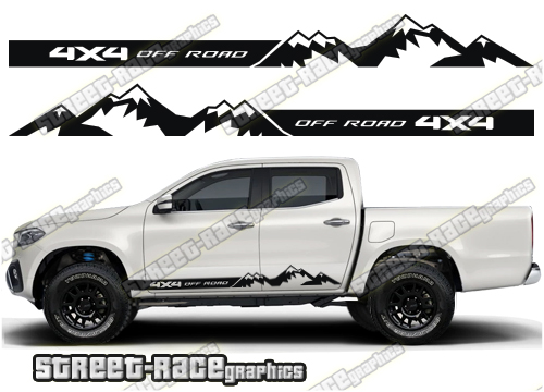 Mercedes X250D / X350D side racing stripes stickers with a mountain / off-road 4×4 theme.